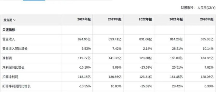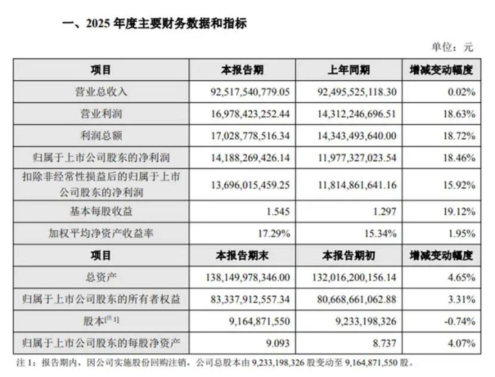 从1月份披露的2025年业绩快报来看,公司预计2025年度共实现营业收入925.18亿元,比上年同期增长0.02%;净利润141.88亿元,比上年同期增长18.46%;扣非净利润136.96亿,比上年同期增长15.92%。